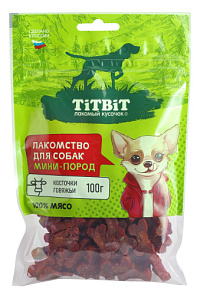 В ассортименте TiTBiT много разных вкусняшек, вы легко сможете подобрать лакомство или полнорационный корм для своей собаки.