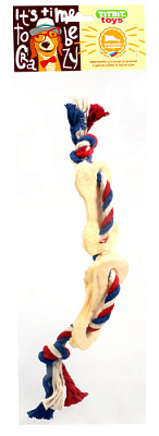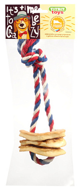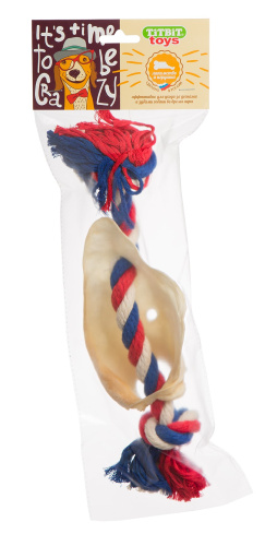 Оригинальная и привлекательная для собак комбинация игрушки (прочного хлопкового каната диам.18 мм с узлами) и ароматного натурального лакомства – говяжьего уха. Структура каната и лакомства способствует укреплению десен, очищению зубов собаки от налёта и снижению риска образования зубного камня.