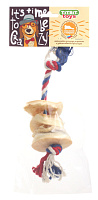 Оригинальная и привлекательная для Вашего питомца комбинация игрушки: прочный 100% хлопковый канат диаметром 10 мм с узлами и ароматное натуральное лакомство из говяжьей кожи. Структура каната и лакомства способствует очищению зубов Вашего питомца от налета, укреплению десен и снижению риска образования зубного камня.