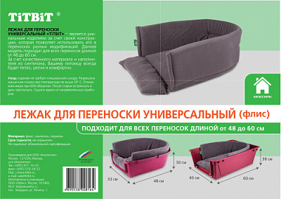 Лежак для переноски универсальный «TiTBiT» – является уникальным изделием за счет своей конструкции, которая позволяет использовать его в переносках разных модификаций. Данная модель подходит для всех переносок длиной от 48 до 60 см. За счет качественного материала и наполнителя из синтепона, Вашему питомцу всегда будет тепло, уютно и комфортно. Уход: изделие не требует специального ухода. Разрешена машинная стирка при температуре не выше 30°С. Отжим максимум при 600 оборотах. После стирки встряхнуть и дать просохнуть. Сушить вдали от нагревательных приборов.