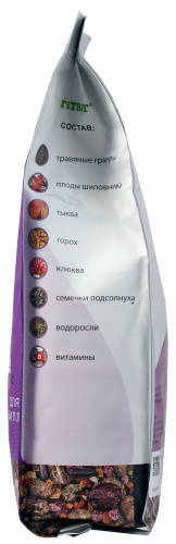 травяные гранулы, плоды шиповника, тыква, горох, клюква, семечки подсолнуха, водоросли, витамины.