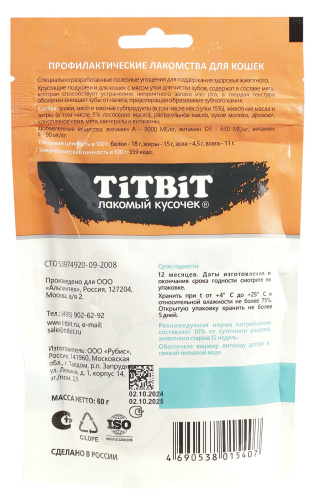 Профилактические лакомства для кошек TiTBiT - специально разработанные полезные угощения для поддержания здоровья животного. Хрустящие подушечки для кошек с мясом утки для чистки зубов, содержат в составе мяту, которая способствует устранению неприятного запаха изо рта, а твердая текстура оболочки очищает зубы от налета, предотвращая образования зубного камня.
