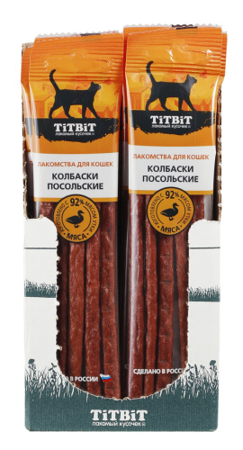 Золотая коллекция – это линейка лучших лакомств TITBIT, разработанных при участии владельцев домашних животных и их питомцев. Колбаски «Посольские» приготовлены c добавлением мяса утки. Вкусовая палитра лакомства дополнена нежным куриным филе. Эти колбаски станут прекрасным угощением для вашего питомца.