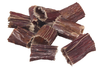 Высушенный говяжий пищевод, разрезанный поперёк на колечки шириной 2 см. Упаковка содержит 6-8 штук. Высокое содержание аминокислот, коллагена и микроэлементов. Способствуют укреплению десен и жевательных мышц. Оказывает положительное воздействие на состояние кожи, шерсти и общий обмен веществ собаки.
