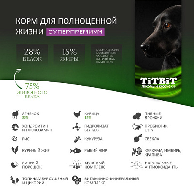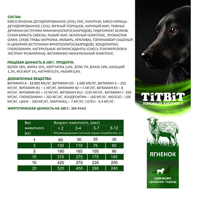 TiTBiT сбалансированный сухой корм Суперпремиум класса с ягненком для щенков средних пород, специально разработан для удовлетворения потребностей щенков. Содержит все необходимые витамины, минералы и микроэлементы, необходимые для здорового развития. Обладает великолепными вкусовыми качествами. Оптимально подобранное соотношение животных белков и жиров для щенков средних пород, помогает обеспечить питомца необходимой энергией для активной и здоровой жизни.