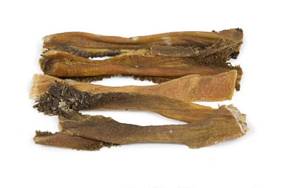 Высушенные пластины говяжьего рубца. Упаковка содержит 4-5 пластин длиной 19 см. Рубец говяжий представляет собой часть желудка КРС, точнее - первый из его преджелудков, в котором содержится полезная микрофлора. Ворсинки неочищенного сушёного рубца сохраняют на себе ферменты и витамины группы «В», вырабатываемые его микрофлорой при жизни животного. Содержат низкокалорийный, легкоусвояемый белок. Благодаря особой технологии сушки сохраняется до 60% процентов полезных веществ.