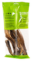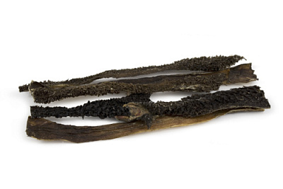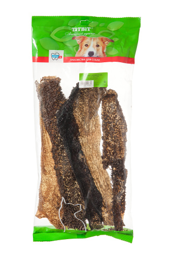 Высушенные пластины говяжьего рубца. Упаковка содержит 4-5 пластин длиной 35-40 см. Рубец говяжий представляет собой часть желудка КРС, точнее - первый из его преджелудков, в котором содержится полезная микрофлора. Ворсинки неочищенного сушёного рубца сохраняют на себе ферменты и витамины группы «В», вырабатываемые его микрофлорой при жизни животного. Содержат низкокалорийный, легкоусвояемый белок. Благодаря особой технологии сушки сохраняется до 60% процентов полезных веществ.