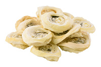 Высушенные основания говяжьих ушей (внутренняя часть раковины, обрамленная кольцом мышечной ткани). Высокое содержание коллагеновых и эластиновых волокон обеспечивает поступление в организм незаменимых компонентов для роста и поддержания качества хрящевой ткани суставов Вашего питомца. Высокое содержание коллагена и эластина способствует улучшению формирования ушного хряща для пород собак, стандартом которых предусмотрен вертикальный постав ушной раковины.