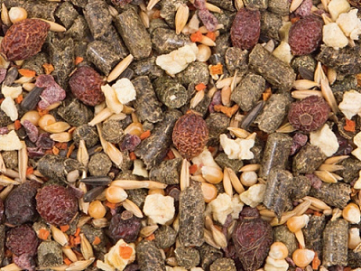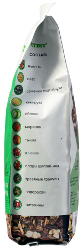 ячмень, овёс, кукуруза, яблоко, морковь, тыква, клюква, плоды шиповника, травяные гранулы, водоросли, витамины.