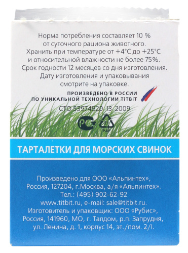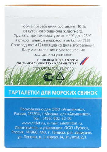 Тарталетки представляют собой корзиночки из хрустящего пресного теста с лакомой и полезной для грызунов начинкой. Обогащают ежедневный рацион витаминами, макро – и микроэлементами. Подходят для морских свинок всех пород и возрастов. Особая структура выпечки способствует укреплению десен и зубов. Продукт не содержит искусственных красителей и ароматизаторов. Тыква, входящая в состав продукта, содержит большое количество каротина и витаминов, легко усваивается организмом грызуна. В тыкве содержится кальций, калий, фосфор, железо, медь, фтор и цинк, каротин, витамины С, группы В. Ананас богат сахарозой, лимонной и особенно аскорбиновой кислотой, кроме этого в ананасе присутствуют витамины В1, В2, В12, РР, провитамин А, минеральные вещества и фермент бромелин, благодаря чему этот продукт стимулирует пищеварение и повышает иммунитет.