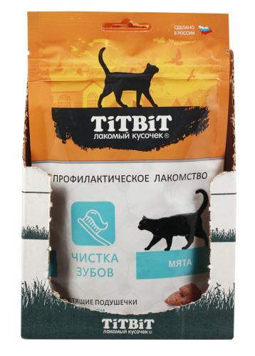 Профилактические лакомства для кошек TiTBiT - специально разработанные полезные угощения для поддержания здоровья животного. Хрустящие подушечки для кошек с мясом утки для чистки зубов, содержат в составе мяту, которая способствует устранению неприятного запаха изо рта, а твердая текстура оболочки очищает зубы от налета, предотвращая образования зубного камня.