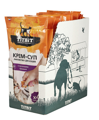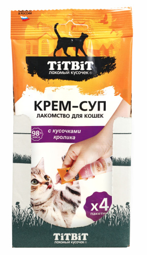 Крем-суп для кошек TITBIT – это специально разработанные вкусные и полезные продукты, которые: 1. Содержат кусочки свежего мяса; 2. Содержат 98% мясных ингредиентов; 3. Содержат дополнительные полезные ингредиенты (таурин для поддержки зрения, сердца, пищеварительной, половой и иммунной систем; морковь для поддержки зрения и пищеварения; петрушка для поддержки мочеполовой, сердечно-сосудистой и пищеварительной систем).