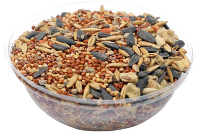 просо желтое, просо красное, просо белое, овес, подсолнух черный, льняное семя, канареечное семя, конопляное семя, пшеница, яблоко, морковь, речные ракушки дробленые, водоросли, витамины.