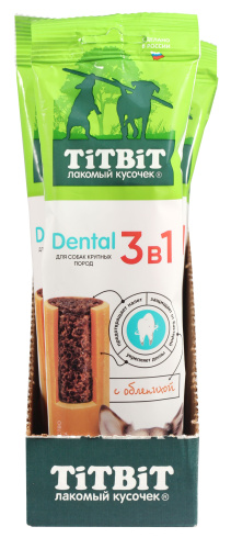 DENTAL 3в1 - профилактическое лакомство для комплексного ухода за зубами и деснами собак. Благодаря комбинированной текстуре и полезным добавкам использование снека позволит поддерживать здоровье ротовой полости животного в отличном состоянии: 1 - внешний гладкий слой - обеспечивает массаж и укрепление десен; 2 - внутренний пористый слой - предотвращает образование налета; 3 - облепиха - способствует защите от бактерий.