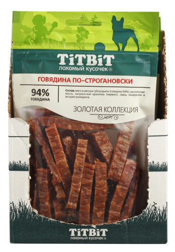Золотая коллекция – это линейка лучших лакомств TITBIT, разработанных при участии владельцев домашних животных и их питомцев. Говядина по-строгановски - это мясной деликатес, который, благодаря высокому содержанию мяса (94 %) и бережной технологии приготовления, имеет привлекательный внешний вид, невероятный вкус и нежную текстуру. Говядина, входящая в основу лакомства, обогащает организм высококачественным животным белком и аминокислотами. Ни один гурман не сможет устоять перед таким деликатесом.