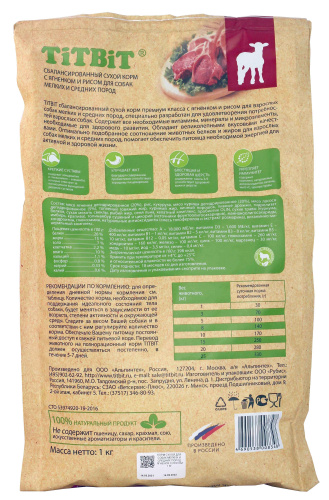 TiTBiT сбалансированный сухой корм премиум класса с ягненком и рисом для взрослых собак мелких и средних пород, специально разработан для удовлетворения потребностей взрослых собак. Содержит все необходимые витамины, минералы и микроэлементы, необходимые для здорового развития. Обладает великолепными вкусовыми качествами. Оптимально подобранное соотношение животных белков и жиров для взрослых собак мелких и средних пород, помогает обеспечить питомца необходимой энергией для активной и здоровой жизни.