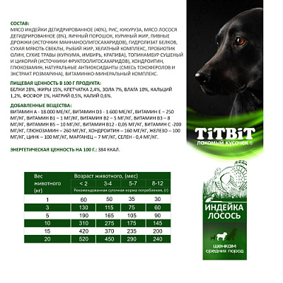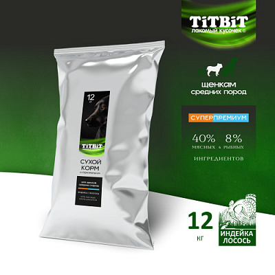 TiTBiT сбалансированный сухой корм Суперпремиум класса с индейкой и лососем для щенков средних пород, специально разработан для удовлетворения потребностей щенков. Содержит все необходимые витамины, минералы и микроэлементы, необходимые для здорового развития. Обладает великолепными вкусовыми качествами. Оптимально подобранное соотношение животных белков и жиров для щенков средних пород, помогает обеспечить питомца необходимой энергией для активной и здоровой жизни.