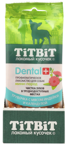 Профилактическое лакомство Dental+ Трубочка с мясом индейки для собак мини-пород содержит экстракт календулы, который обладает дезинфицирующими свойствами. Пористая структура трубочки способствует эффективной чистке зубов собаки в труднодоступных местах.