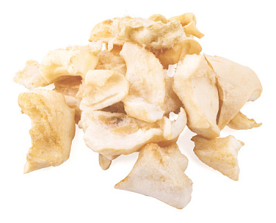 Высушенные кусочки говяжьей кожи. Высокое содержание коллагеновых и эластиновых волокон обеспечивает поступление в организм незаменимых компонентов для роста и поддержания качества хрящевой ткани суставов вашего питомца. Высокое содержание коллагена и эластина способствует улучшению формирования ушного хряща (для пород собак, стандартом которых предусмотрен вертикальный постав ушной раковины).