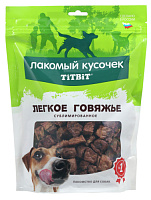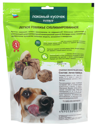 Кусочки говяжьего легкого приготовлены по современной технологии сублимации с последущей низкотемпературной конвекционной сушкой, благодаря этому сохраняется максимальное количество полезных веществ, витаминов и минералов. Легкие очень вкусны, малокалорийны и хорошо усваиваются организмом, содержат практически такой же набор витаминов, как и мясо, при этом гораздо менее жирные. Оказывают положительное воздействие на состояние кожи, шерсти и общий обмен веществ. Кусочки очень удобно использовать в качестве поощрения при дрессуре, и просто на прогулках. Подходят для собак всех пород и возрастов. Особенно рекомендуется для собак с неполной зубной формулой и возрастными изменениями зубочелюстного аппарата. Благодаря вкусовым качествам и воздушной структуре является одним из самых любимых лакомств для наших четвероногих друзей.