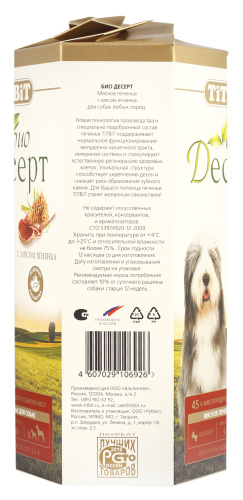 мука в/с грубого помола 53%, зародыш пшеницы 17%, масло растительное 10%, мясо ягненка 9%, рубец диетический 7%, мед 4%.