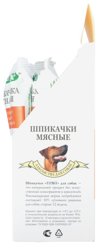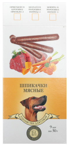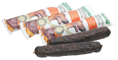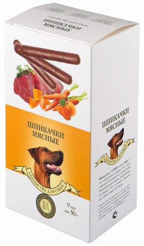 Колбаски для собак Шпикачка. Изготовлены из говяжьего мяса и мясных субпродуктов по колбасной технологии с добавлением таких полезных компонентов, как кукуруза, морковь и печень говяжья. Натуральный продукт, который не содержит красителей и консервантов.