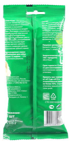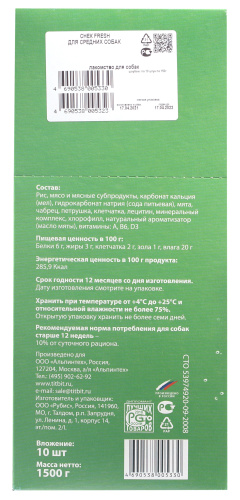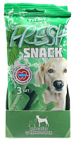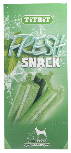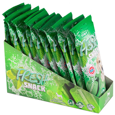 FRESH SNACK это функциональное лакомство для собак. Мята и хлорофилл освежают дыхание и оказывают антибактериальное воздействие. Благодаря специально разработанной эластичной текстуре и натуральным абразивным добавкам (мел и сода питьевая), употребление лакомства способствует снятию мягкого зубного налета и снижению уровня образования зубного камня.