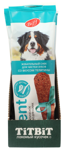 Biff «DENT» со вкусом телятины – это жевательный снек для собак, необходимый для снятия мягкого зубного налёта, снижения уровня зубного камня и массажа дёсен за счет специально разработанной формы и текстуры, используется в качестве лакомства и поощрения. Рекомендуется для собак крупных пород.